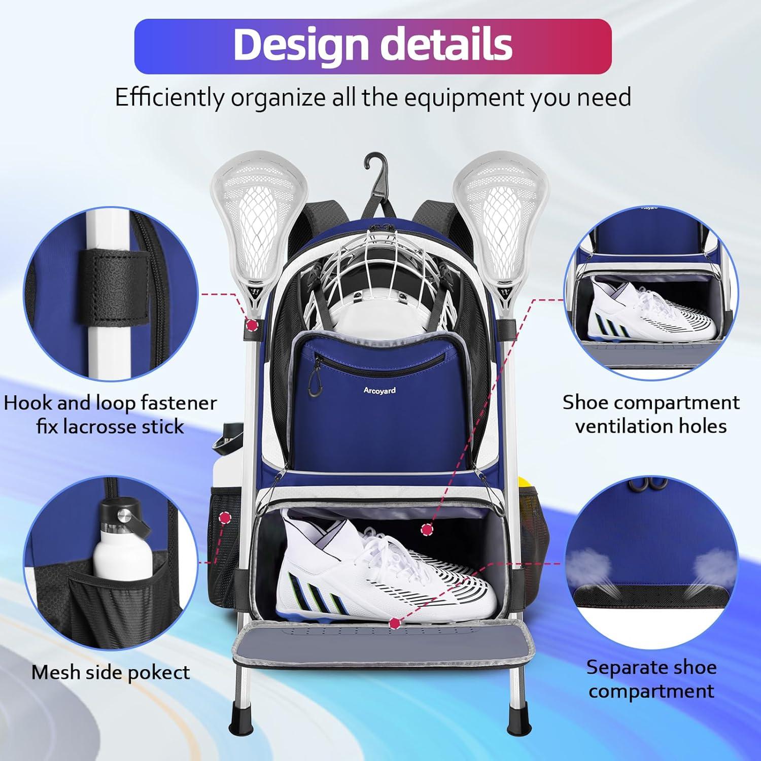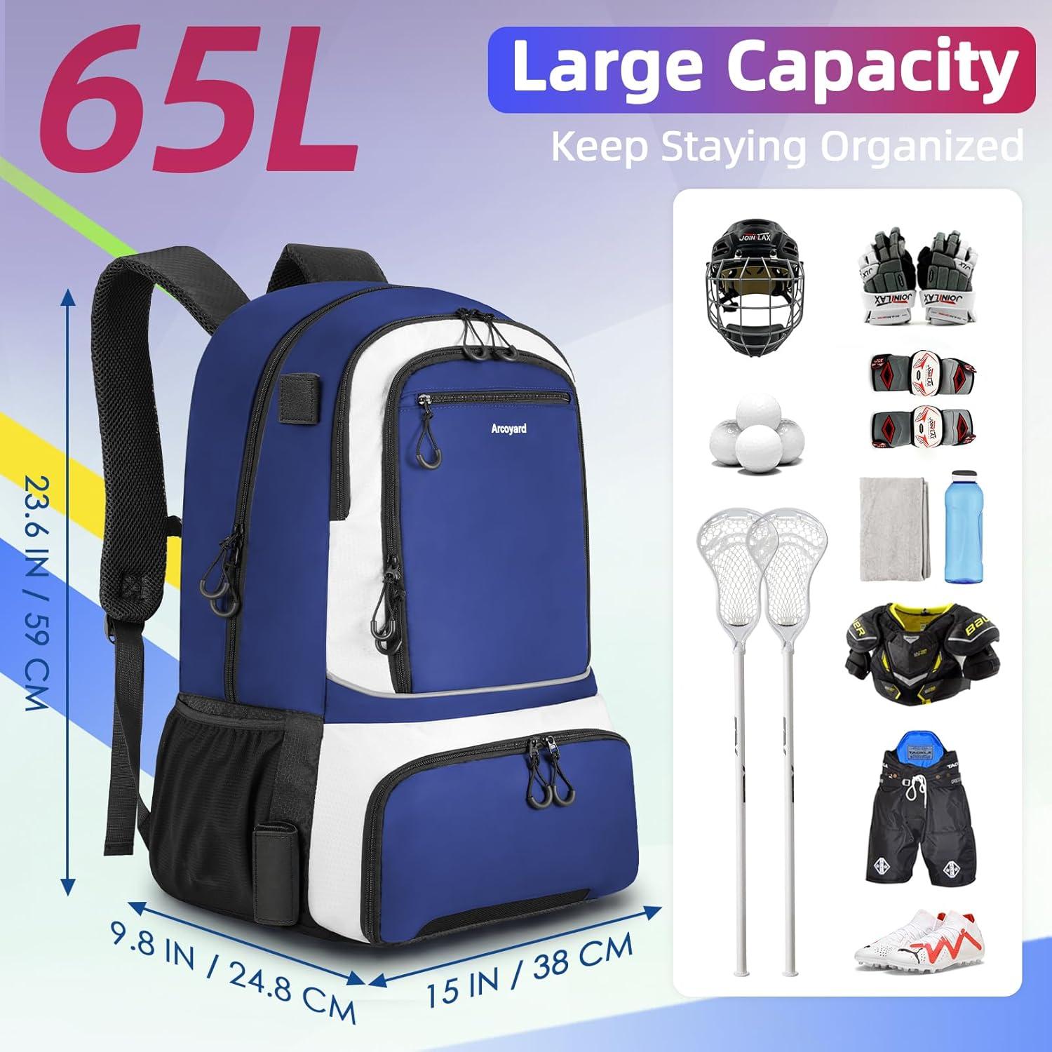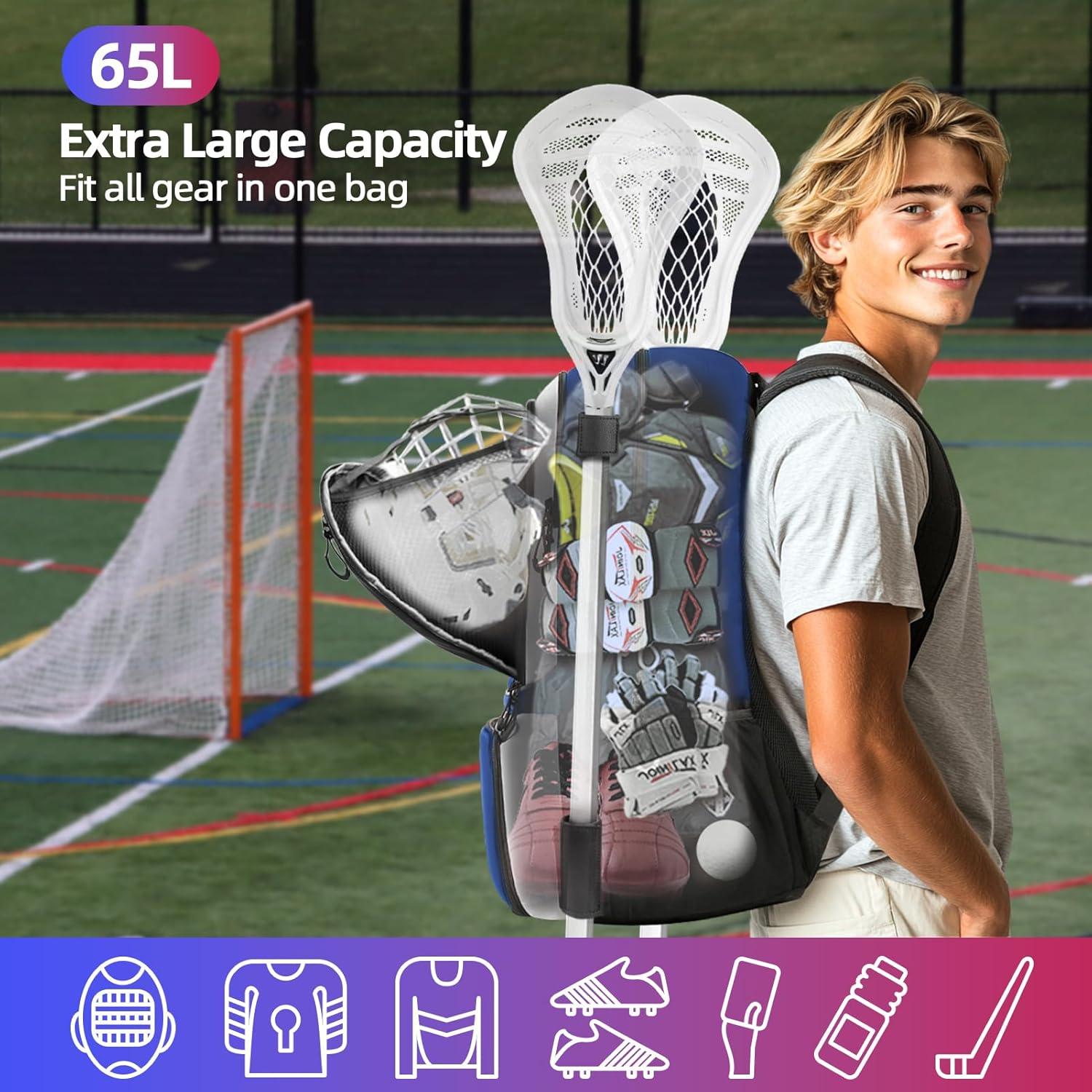 Intelligent Large Space: The lacrosse backpack has a loading capacity of 65 liters and is designed to hold all your sports gear, including two lacrosse sticks of any size, helmet/mask, throat guard, shoulder pads, arm/elbow pads, gloves, goggles, and cleats. The main compartment is also fitted with separate smaller sections for organizing everyday items like your phone, power bank, Bluetooth earphones, notebook, etc