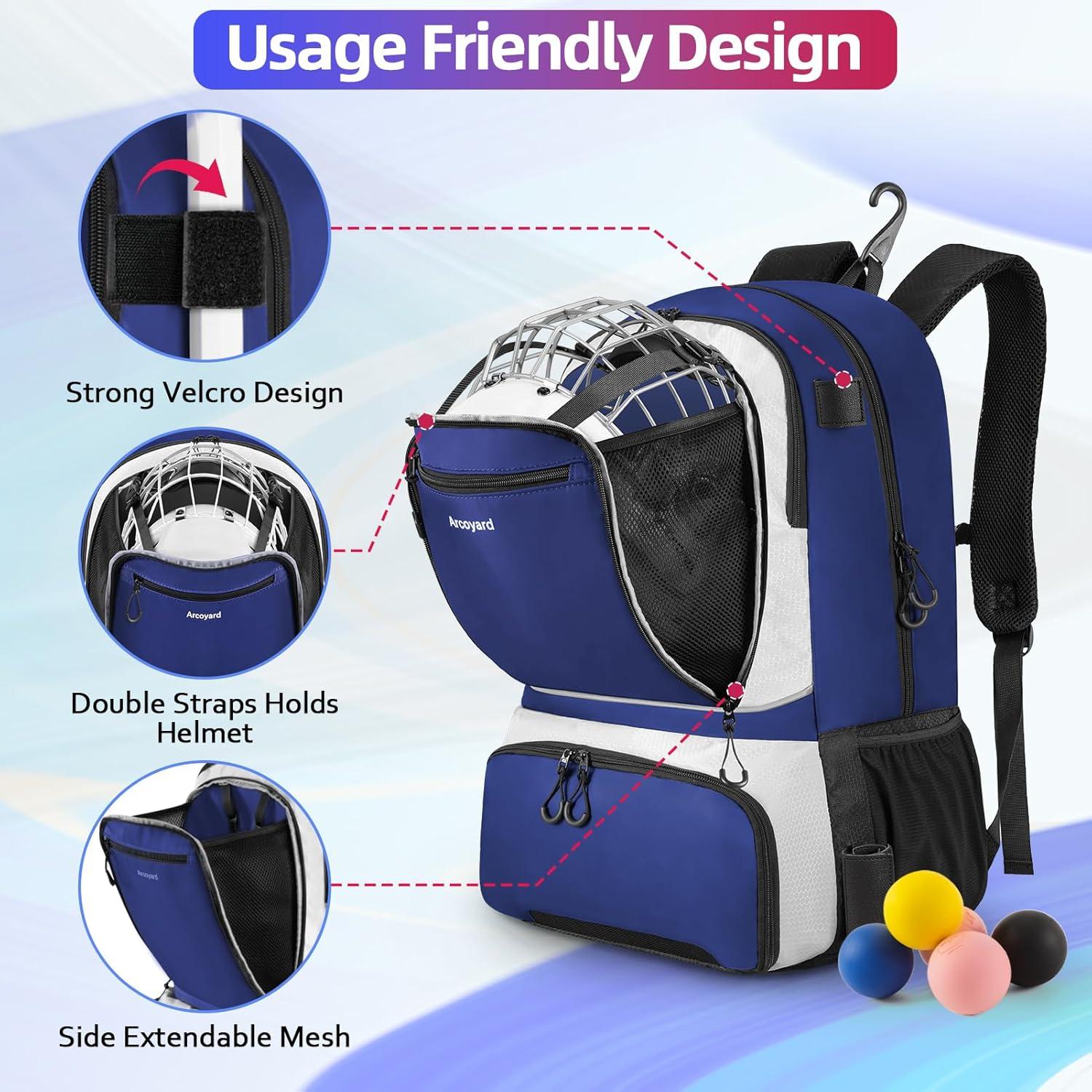 Design Highlights: The lacrosse bags features a discreet, expandable, elastic helmet compartment, designed not to consume space in the main compartment. Inside, there are two high-density material buckle straps for secure helmet (full-size) fixation, offering a simple and efficient solution. This backpack's design is also suitable for field hockey, basketball, soccer, baseball, and other various sporting events