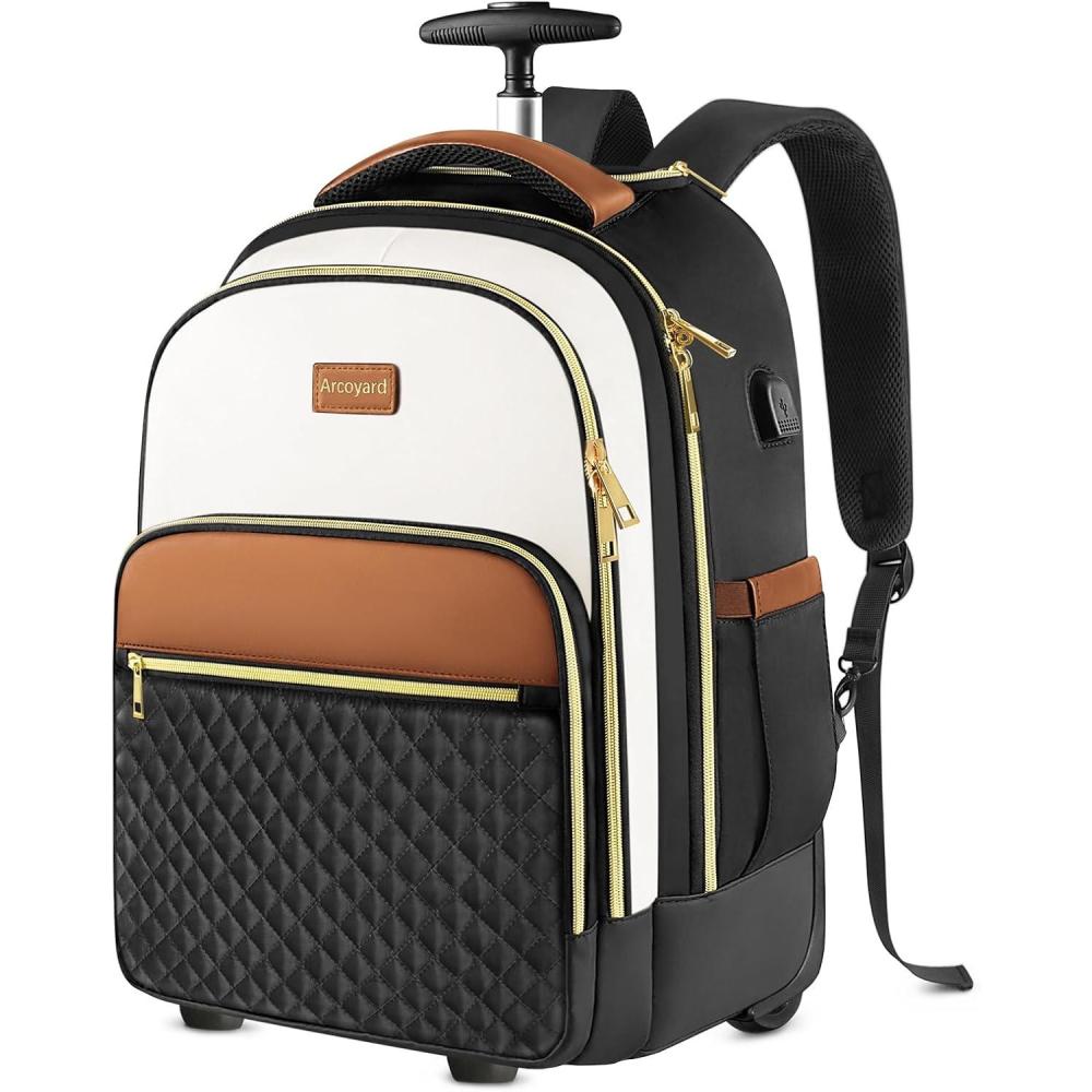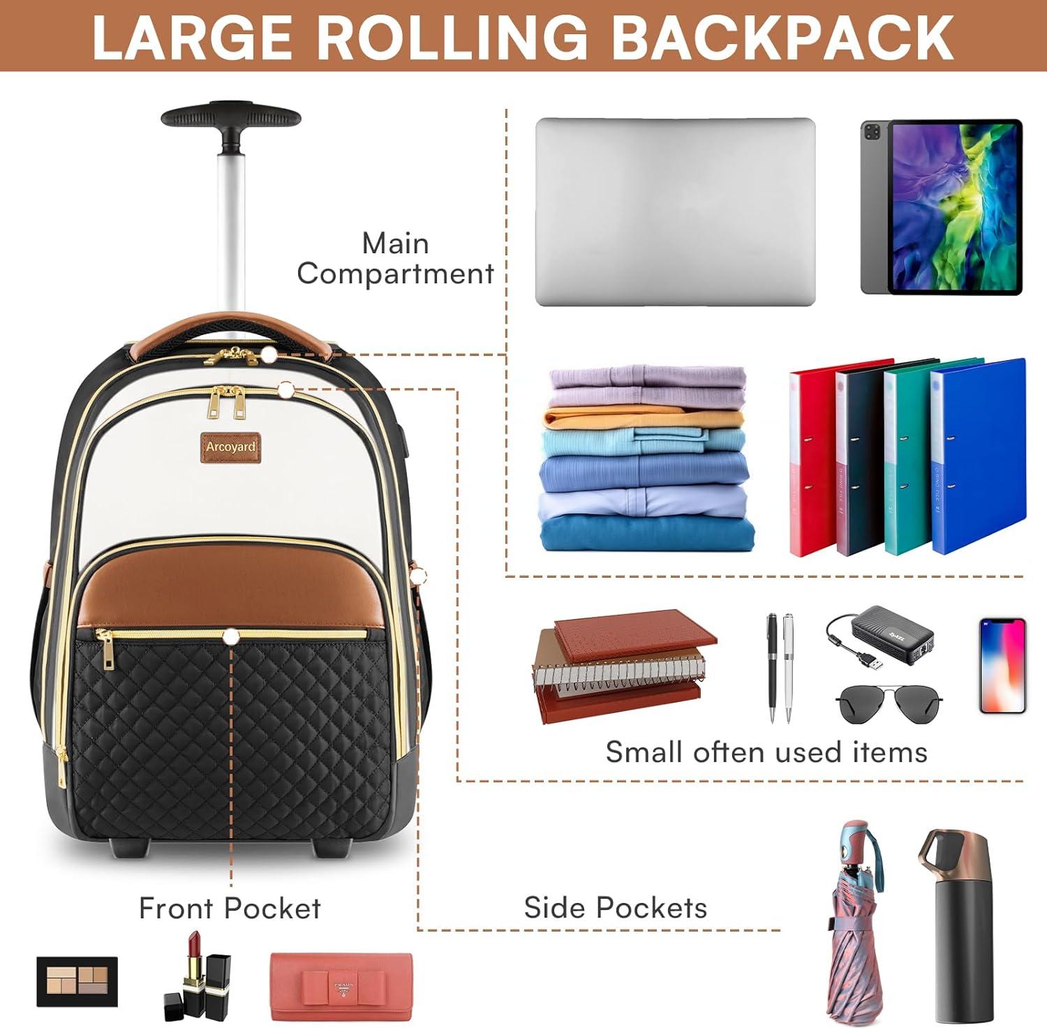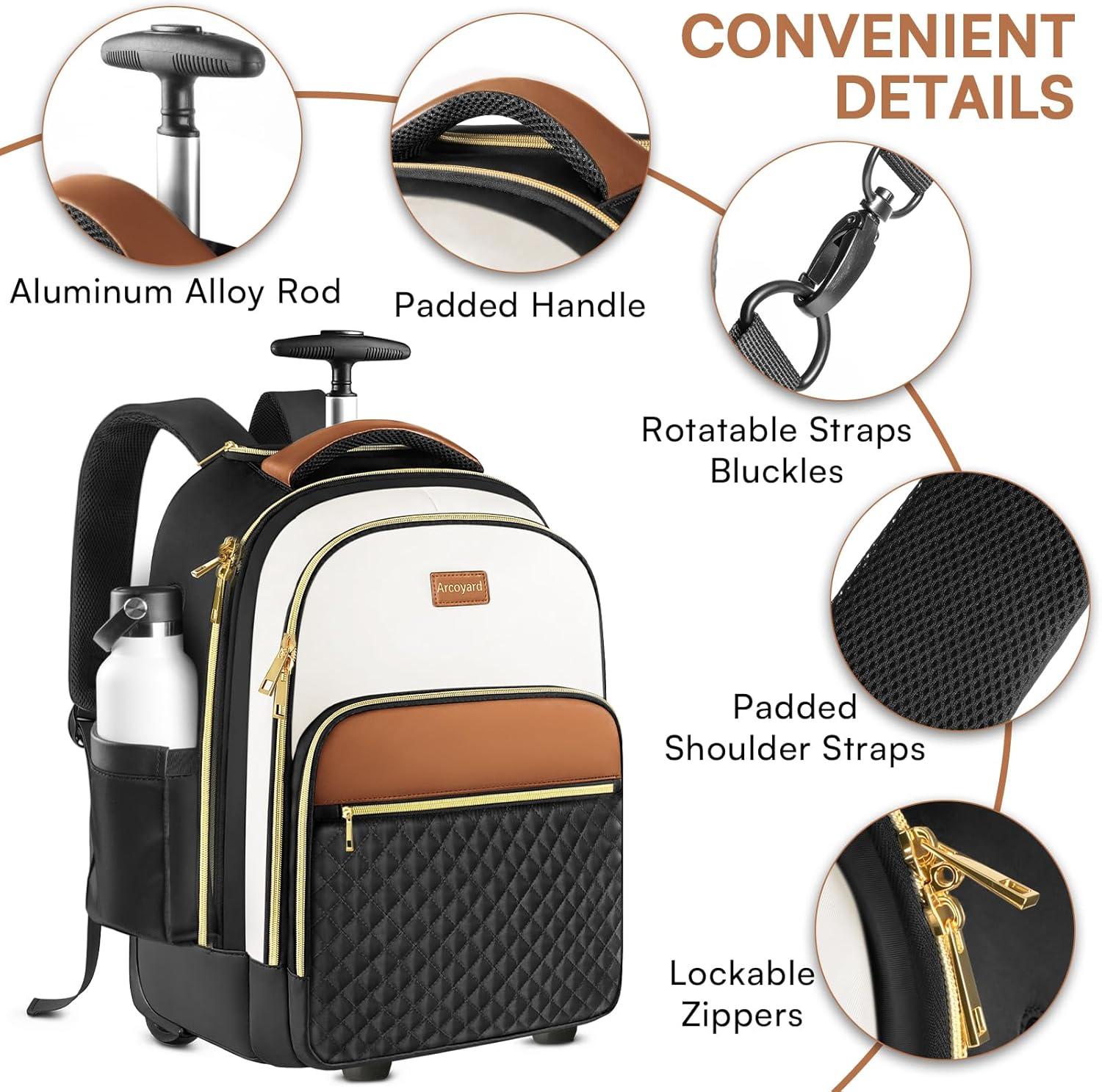 Multi-Purpose: Arcoyard rolling backpack for women is suitable for overnight stays, commuting, business trips. It can be a great gift for businessmen, family and friends, or a gift for her