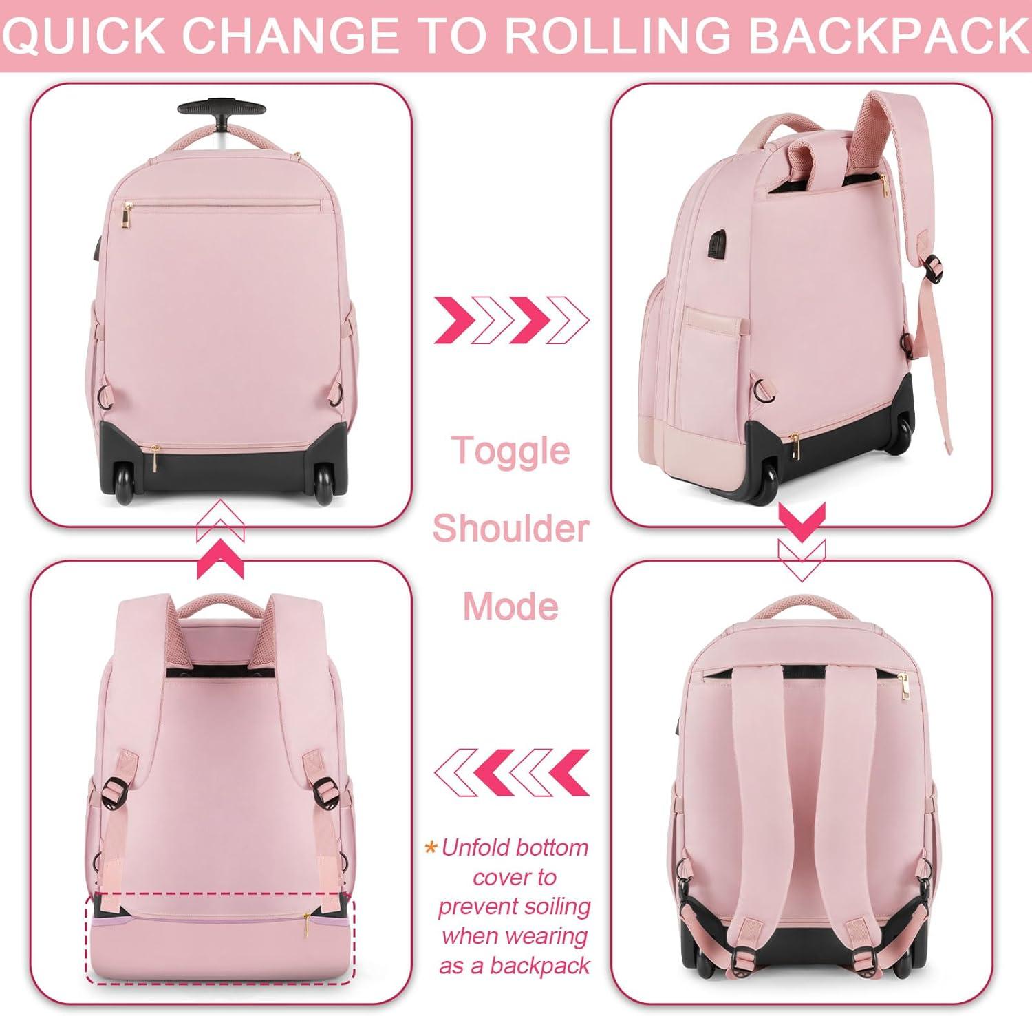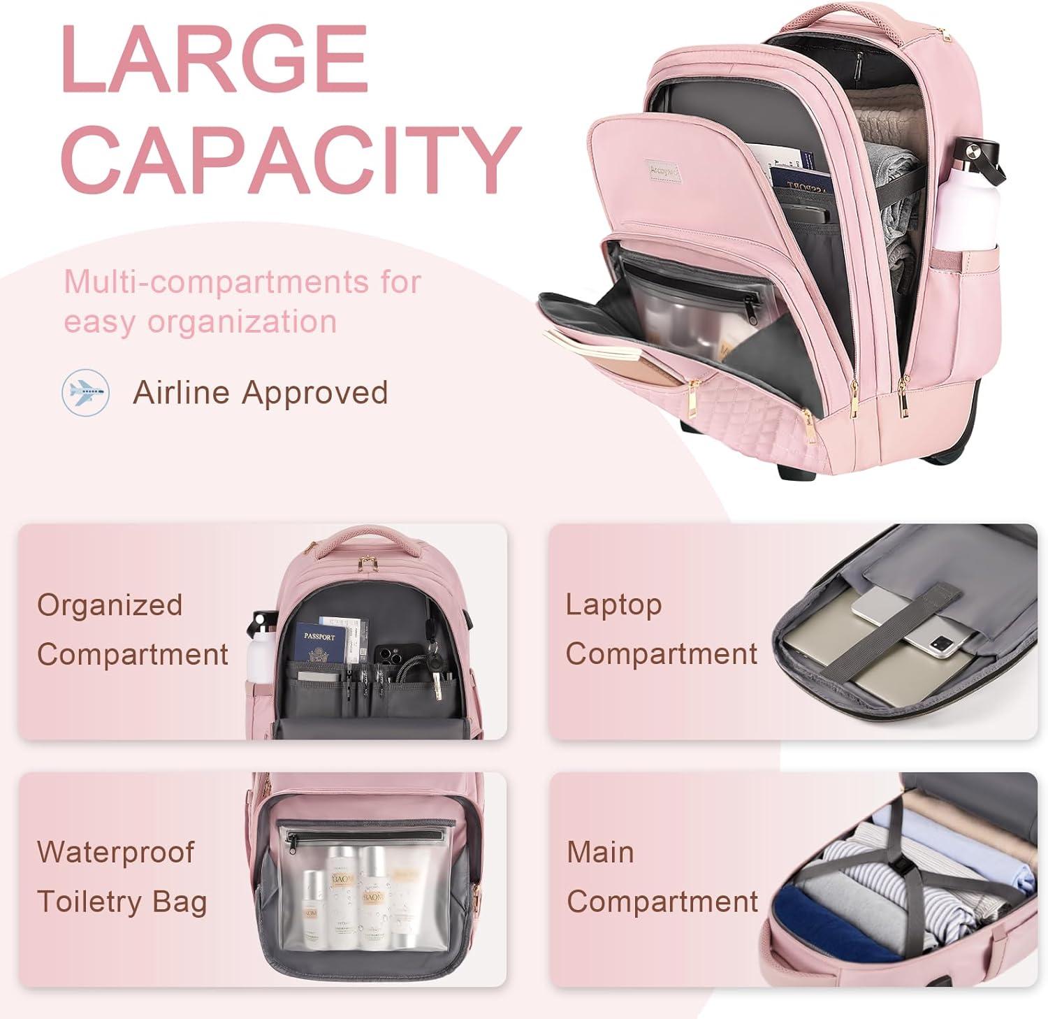 Rolling Backpack Carry On Luggage For Adults With Wheels, 40L Wheeled Backpack For Women, Travel Roller Backpack, Rolling Bag, Pink(Pink)