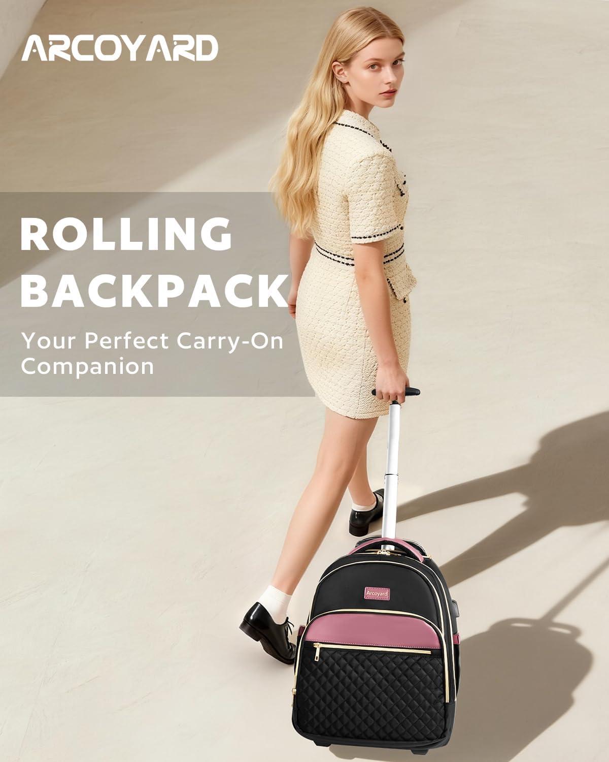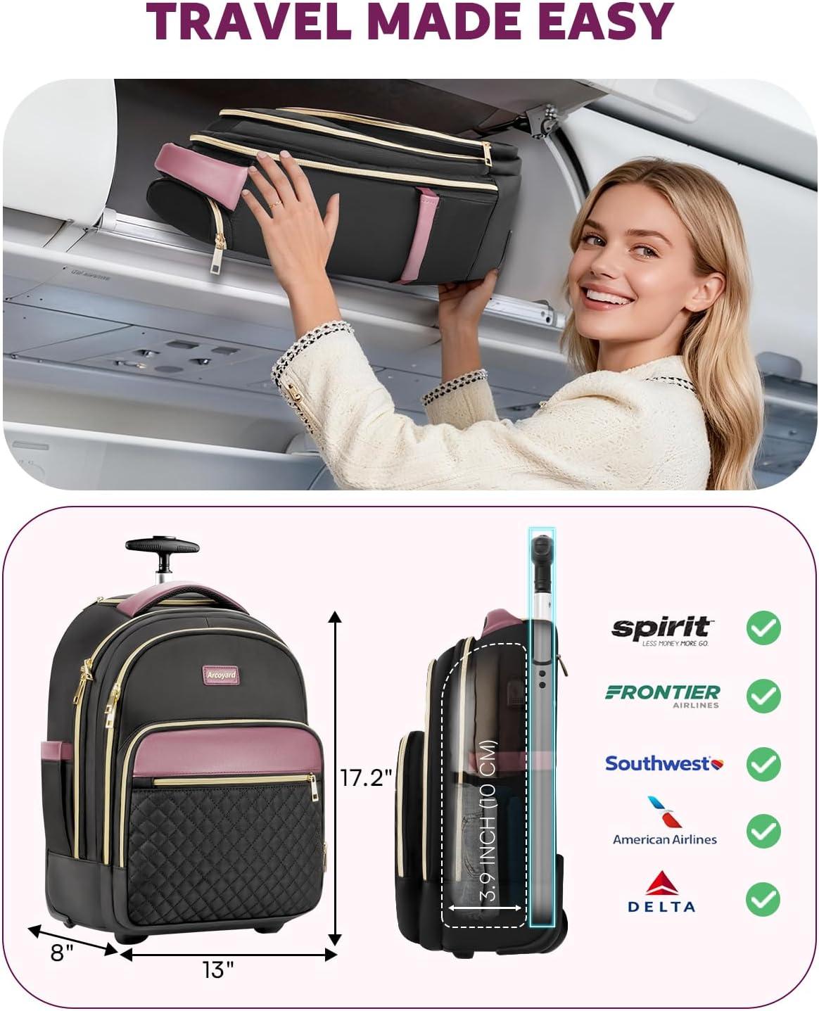imageRolling Backpack for Women with Wheels roller Laptop Travel Backpack Lightweight Water Resistant Wheeled Underseat Carry On Luggage for Work and College Black PurpleBlack Gold