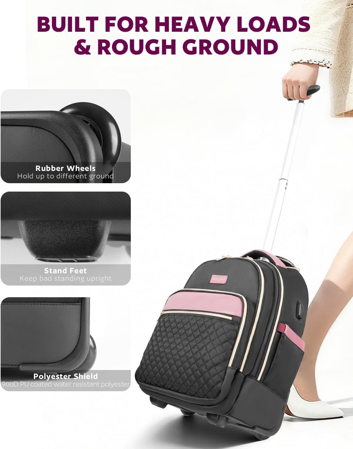 imageRolling Backpack for Women with Wheels roller Laptop Travel Backpack Lightweight Water Resistant Wheeled Underseat Carry On Luggage for Work and College Black PurpleBrown