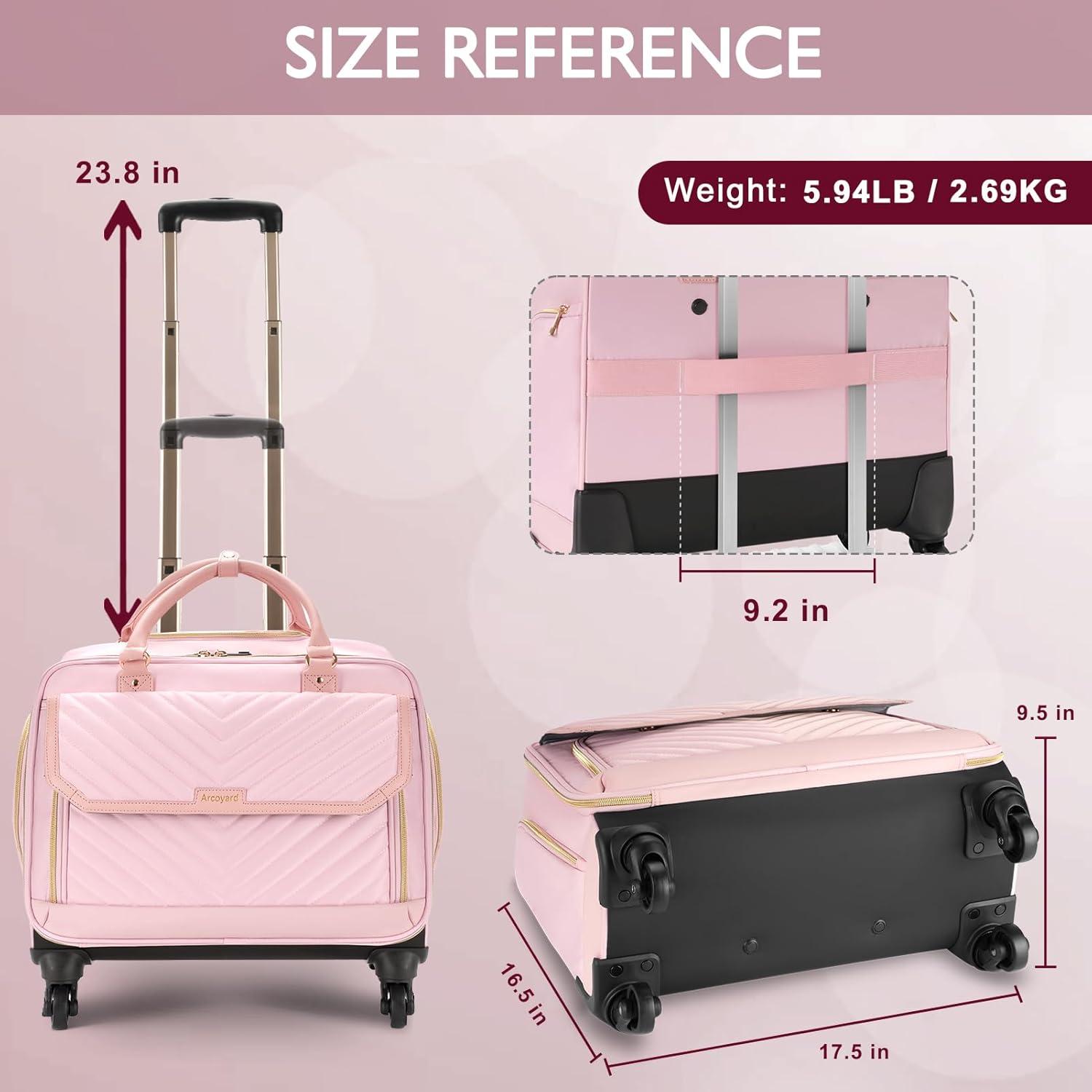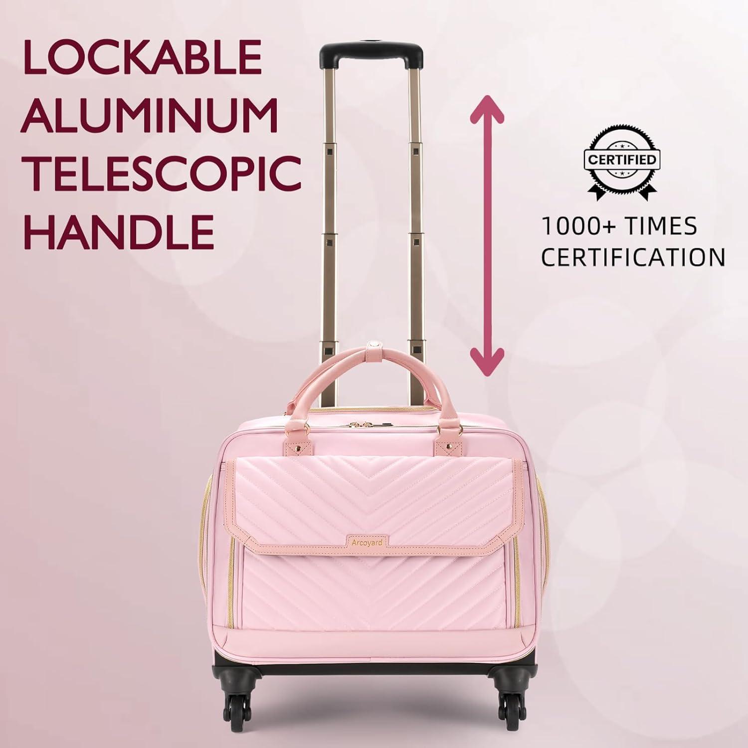 Reinforced Structure: Our rolling briefcase for women features wear-resistant and silent rubber wheels suitable for various terrains, reinforced with a steel axle and high-density engineering plastic. The bottom and sides are covered with waterproof-coated polyester to prevent damage from bumps and scratches. A sturdy, high-quality aluminum telescopic handle can reach up to 40.3 inches in height. accommodating different users