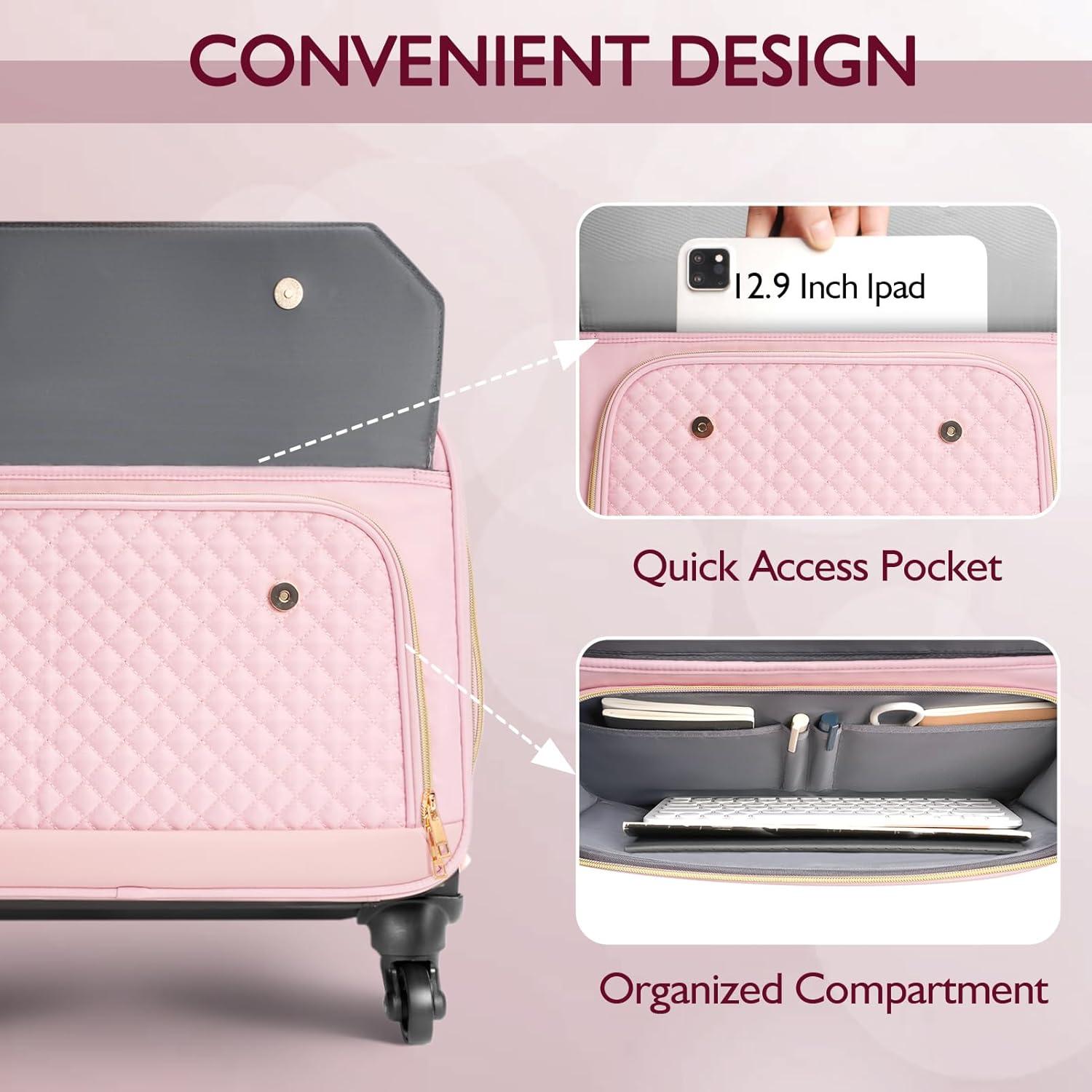 Design: The highlight of this briefcase with wheels lies in ensuring stability on the ground when fully loaded while also allowing for quick passage through airport security checks by being able to open 180 degrees. The bottom of our rolling laptop bag women features an integrated design, coupled with 4 swivel wheels, allowing you to maneuver your luggage from multiple angles, particularly suitable for narrow passages such as airplane aisles