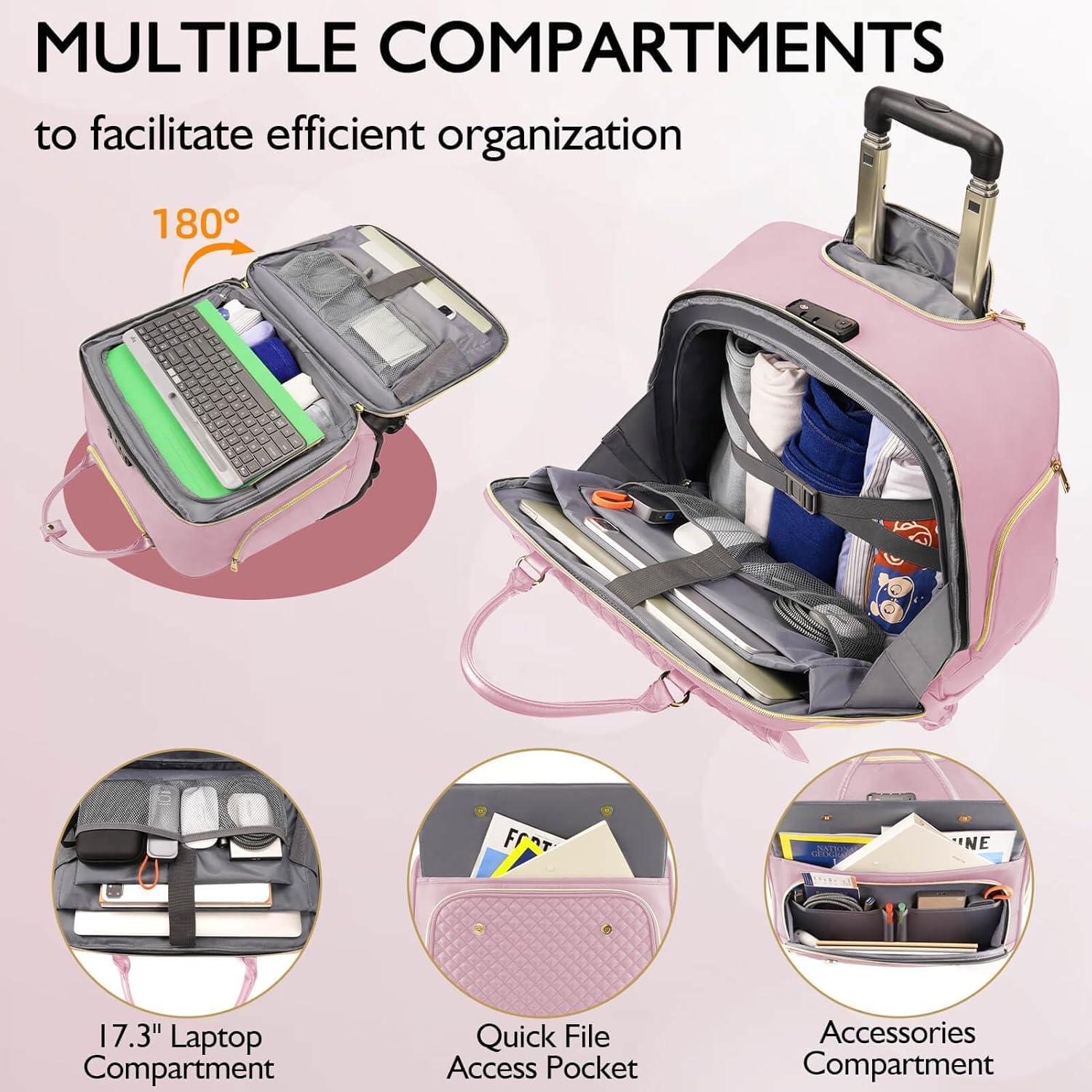 Spacious Compartments: The rolling laptop bag's main compartment features built-in elastic bands with buckles, which can accommodate clothing and personal belongings for a 2-4 day trip. The padded laptop compartment is suitable for an 18-inch laptop. There are individually designed storage spaces for pens, notebooks, tablets, Bluetooth headphones, power banks, and other items, making them easily accessible and saving you from having to search through your bag