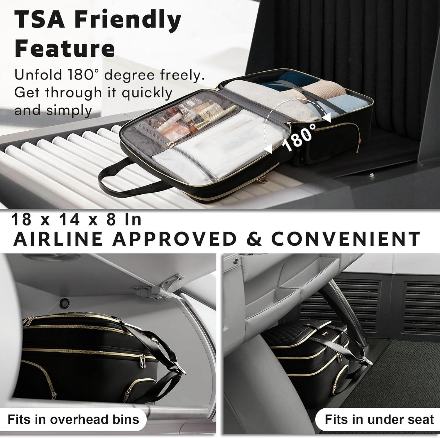 TSA-Friendly & Spacious Compartments: Rolling Computer Bag for women enjoy hassle-free airport with the TSA-friendly design, The size of the overnight bag with wheels is 17.5*13.7*7.0 inches (L*W*H). opening 180 degrees for quick security checks. The main compartment of this rolling briefcase for women for work features elastic bands with buckles for 2-3 days clothes. There’s also a separate padded laptop pocket, and organizational areas for pens, documents, Can also store paperwork, binder.