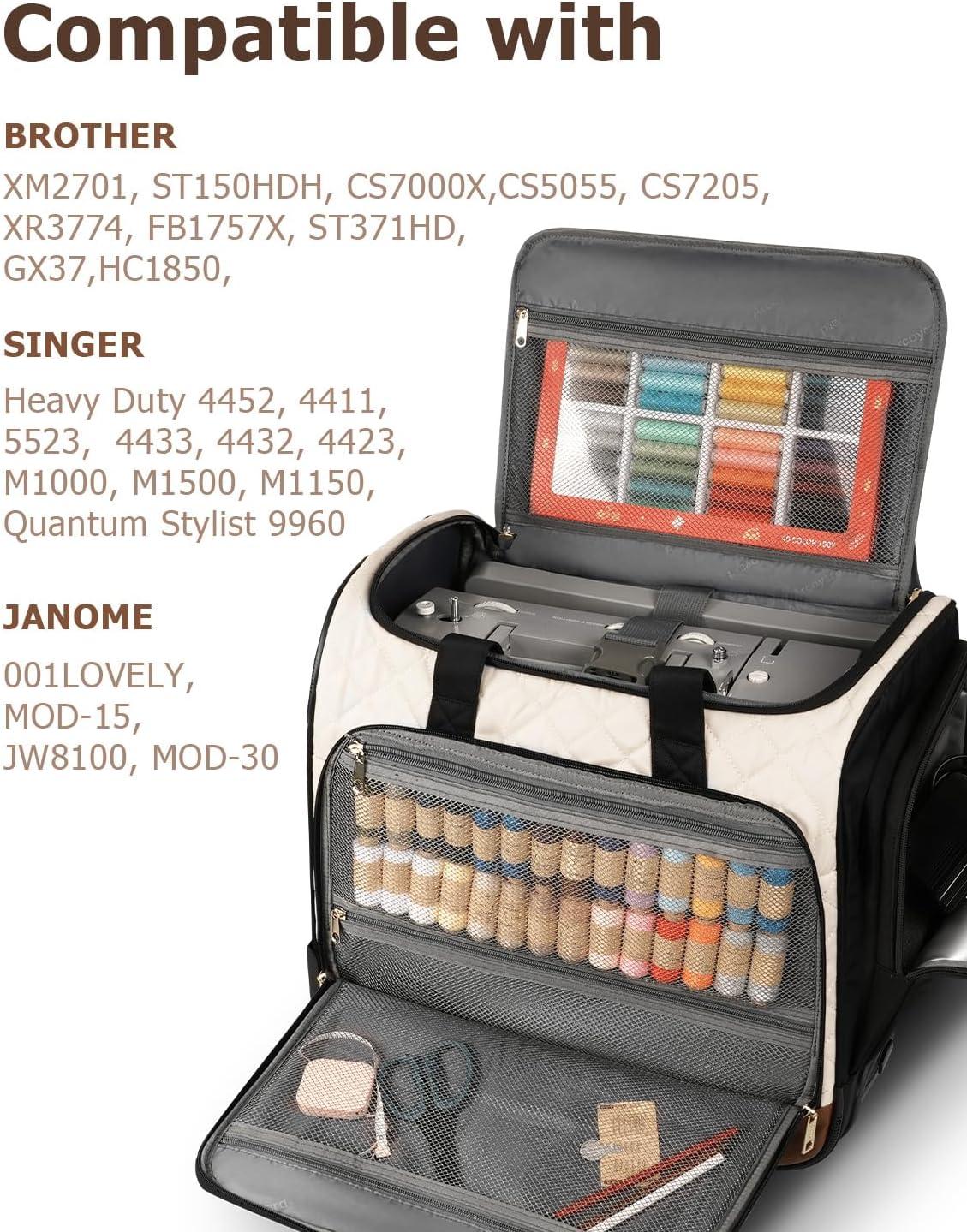 Wide Compatibility: Designed to fit most standard sewing machine, this sewing machine case with wheels is compatible with Brother *XM2701, ST150HDH, CS7000X,CS5055, CS7205, XR3774, FB1757X, ST371HD, GX37, singer *Heavy Duty 4452, 4411, 5523, 4433, 4432, 4423, M1000, M1500, M1150, Quantum Stylist 9960, Janome *001LOVELY, MOD-15, JW8100, MOD-30