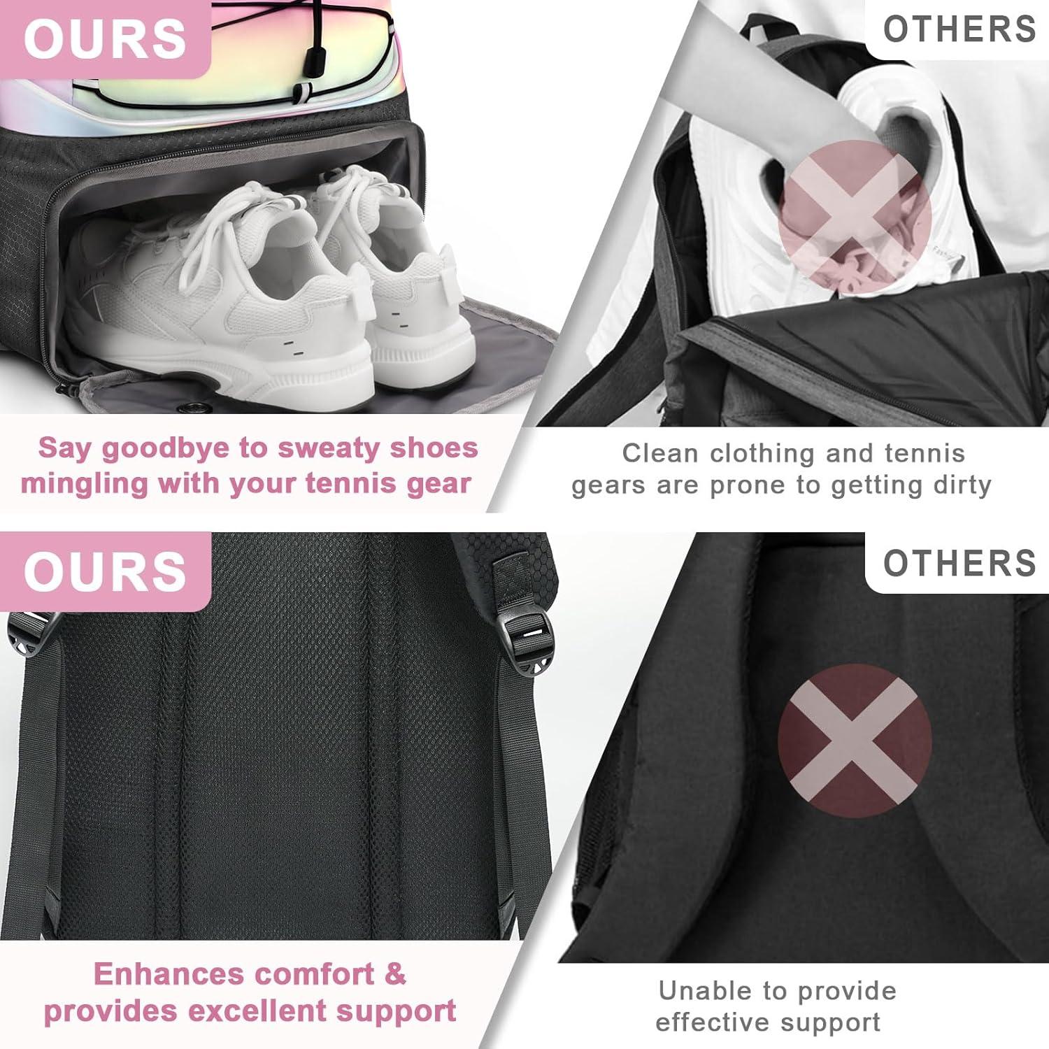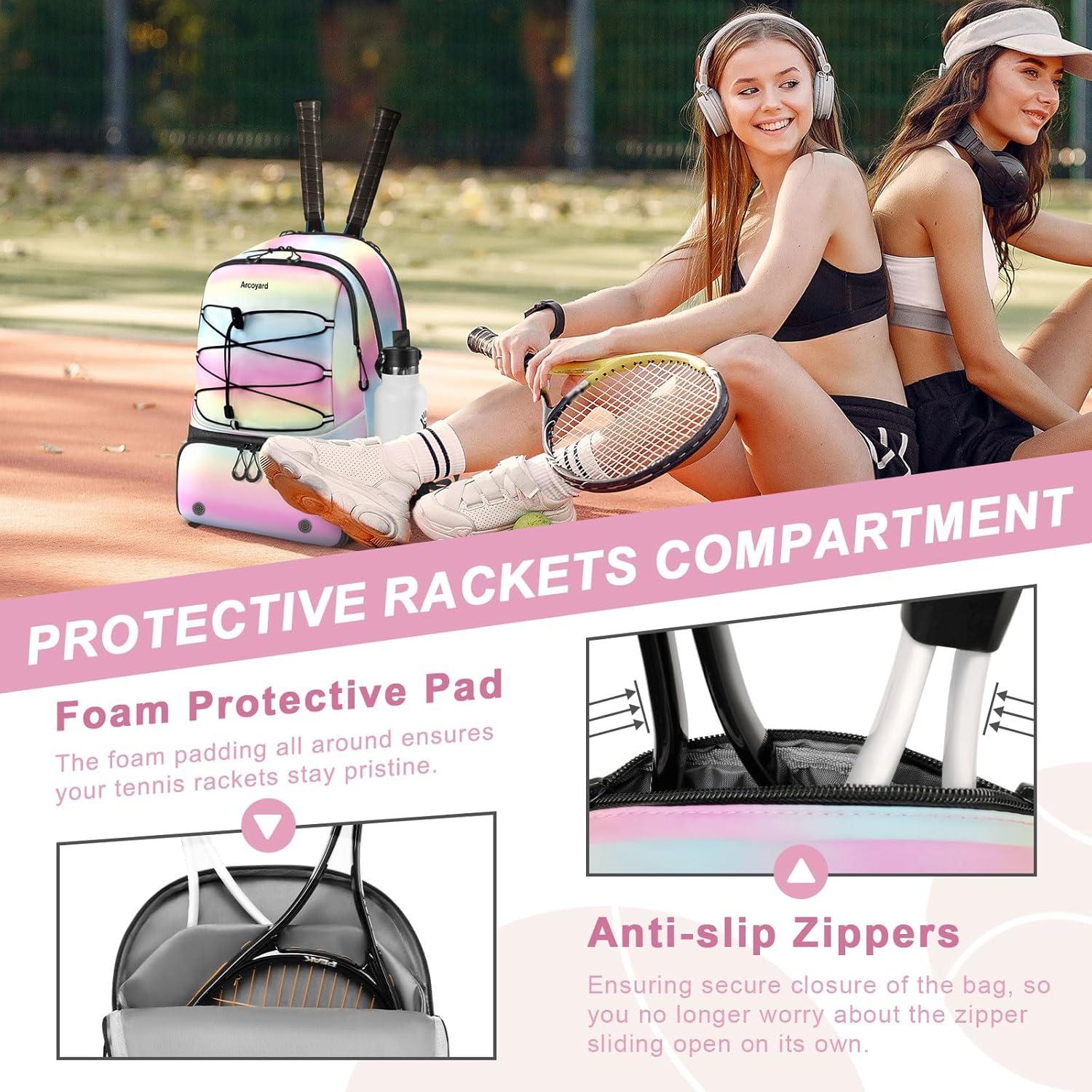 Large Tennis Bag: The racquet compartment features a soft cushion in the middle, capable of holding two tennis or pickleball racquets. It accommodates a 15.6-inch laptop effortlessly, The compartment is designed to limit racquet movement by anti-slip dual zippers, while the main section stores sports attire, tennis balls, towels, and other gear. Inside, specialized pockets secure tablets, phones, cables, and wristbands, eliminating the hassle of searching inside the tennis backpack