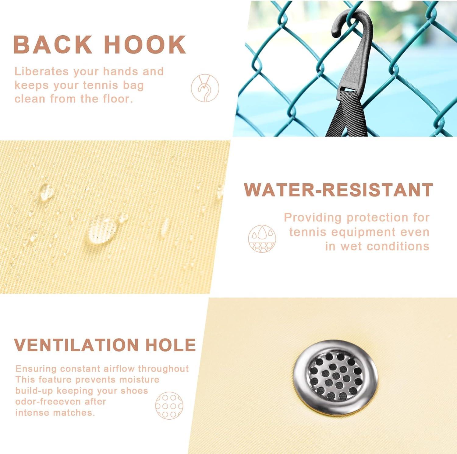 Superior Tennis Racket Bag Materials: Crafted from high-density 900D polyester, the tennis bag excels in waterproofing, stain resistance, and tear resistance. The elastic mesh on the front of the backpack allows for temporary storage, providing quick access to items like towels without opening the main compartments. Versatile, it serves as a tennis or pickleball bag, as well as a travel backpack