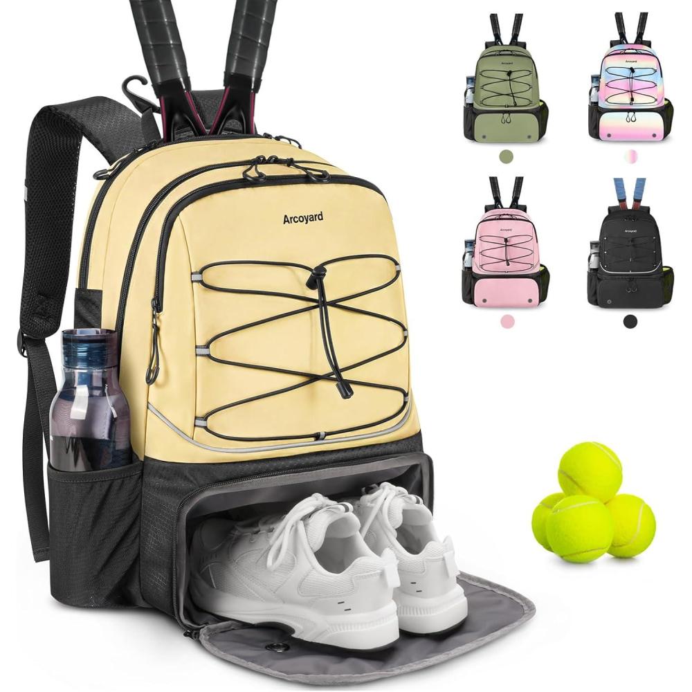 Large Tennis Bag: The racquet compartment features a soft cushion in the middle, capable of holding two tennis or pickleball racquets. It accommodates a 15.6-inch laptop effortlessly, The compartment is designed to limit racquet movement by anti-slip dual zippers, while the main section stores sports attire, tennis balls, towels, and other gear. Inside, specialized pockets secure tablets, phones, cables, and wristbands, eliminating the hassle of searching inside the tennis backpack