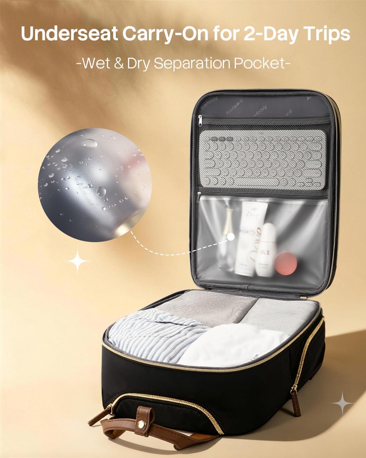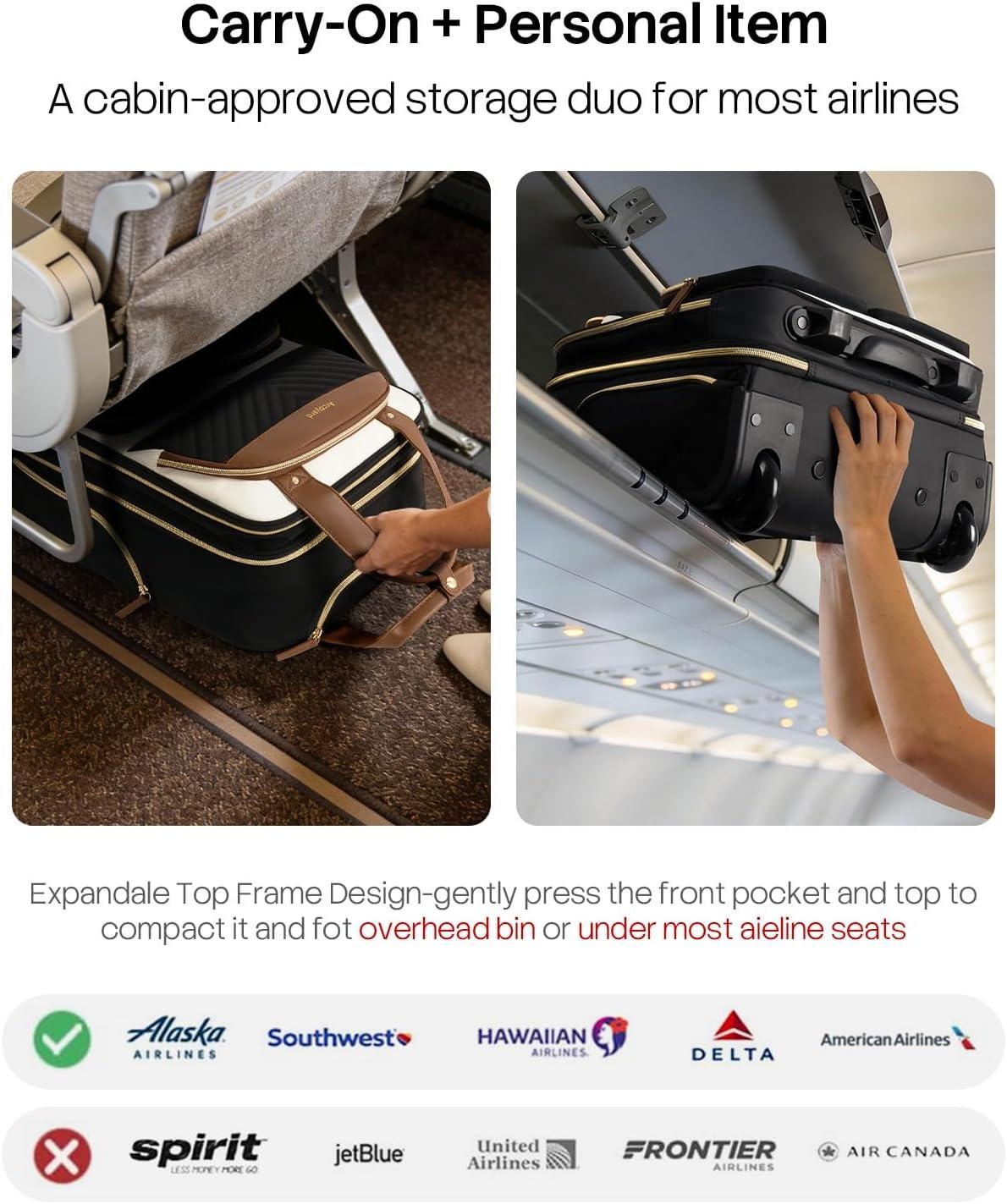 Under seat Carry On Luggage with Wheels, Multiple Compartments Airline Approved Personal Item Bag, Travel Carry-On with Leather Handle, Lightweight Rolling Suitcase for Women, Beige Brown(Black)