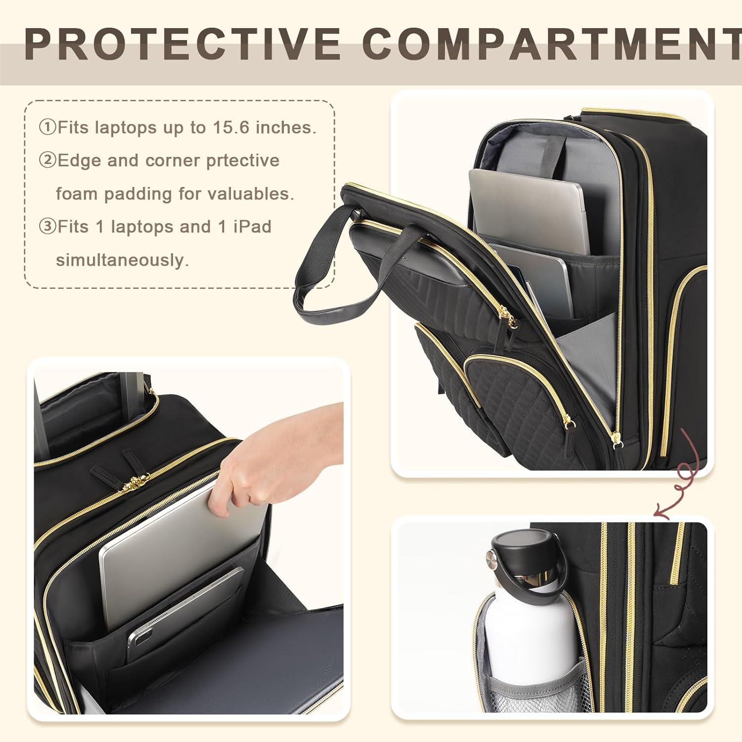 Multifunctional Compartments: The main compartment provides ample space for all your travel essentials and clothing. It also includes a waterproof pocket to protect your toiletries from leaks and spills. Additionally, there's a foam-padded compartment that can safeguard two laptops up to 18 inches in size simultaneously. Three front zippered pockets offer convenient access to frequently used items, keeping everything organized and easily reachable