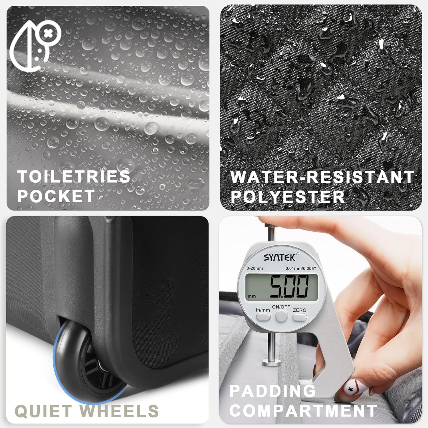 Secure Design: Constructed from premium high-density polyester, our under-seat luggage with wheels provides reliable protection against spills and cuts, keeping your belongings safe and dry. The foam-padded laptop compartment protects your laptop from impacts. Double zipper design with a lock hole allows you to lock it for theft prevention