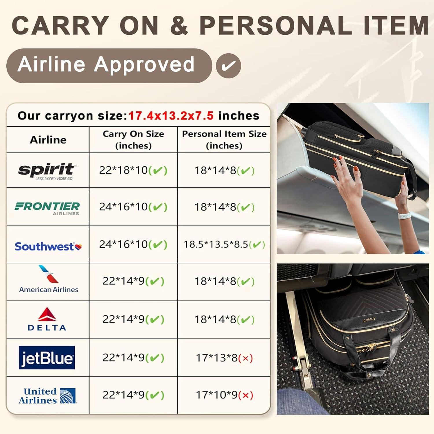 Airline Approved: Carry on luggage with wheels measures 17.4″ H x 13.2″ L x 7.5″ W (including the height of the wheels), meeting approved airline carry on luggage dimensions. This underseat carry on luggage with wheels complies with major airlines' published carry-on luggage and personal item size requirements, including Delta Airline; Southwest Airline; Spirit Airline, etc