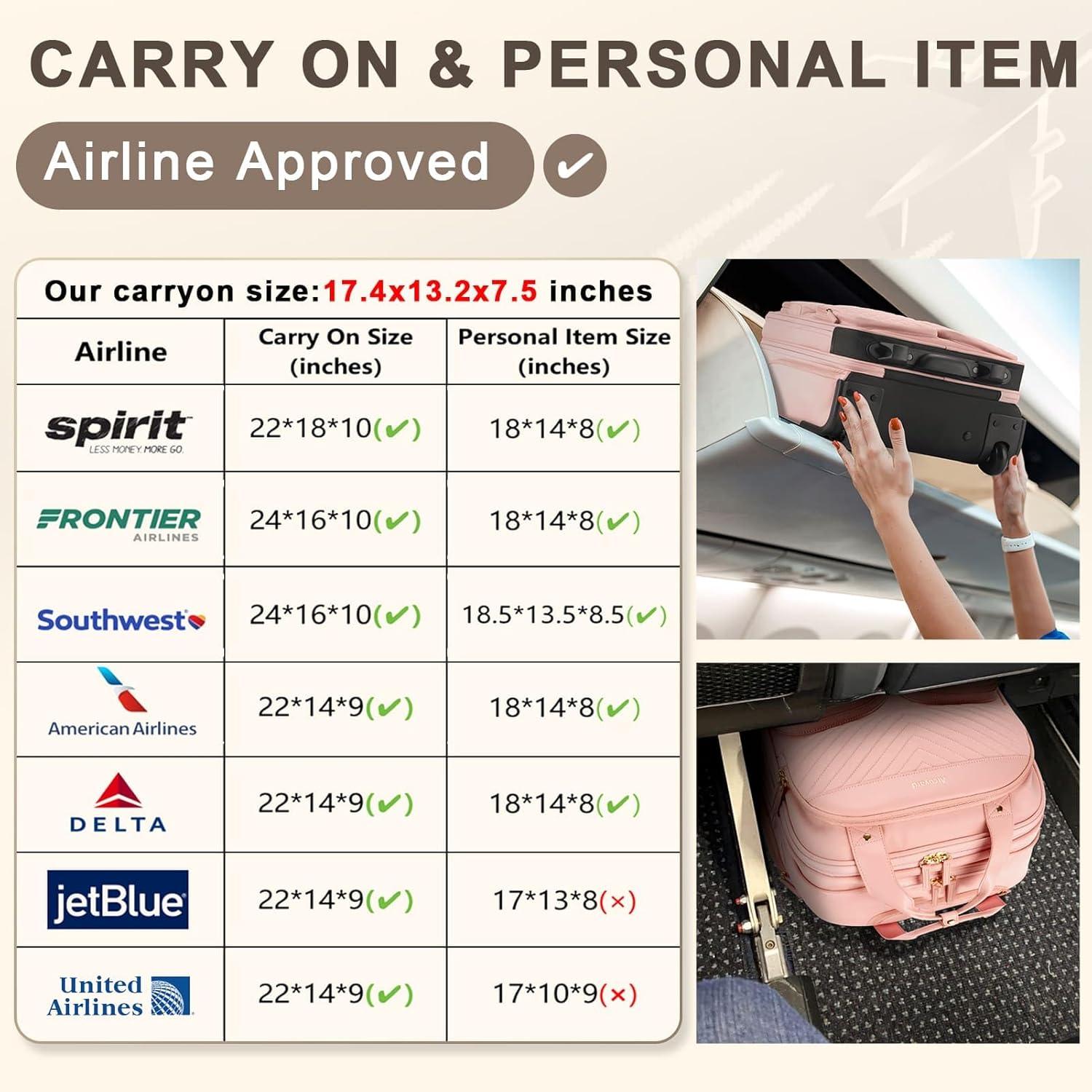 Airline Approved: Carry on luggage with wheels measures 17.4″ H x 13.2″ L x 7.5″ W (including the height of the wheels), meeting approved airline carry on luggage dimensions. This underseat carry on luggage with wheels complies with major airlines' published carry-on luggage and personal item size requirements, including Delta Airline; Southwest Airline; Spirit Airline, etc
